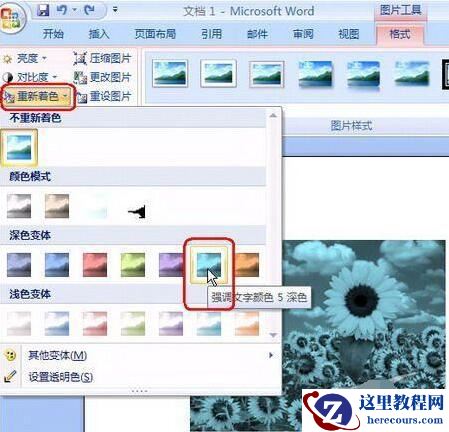 2、轻松重新着色:单击“调整”控件组中的“重新着色”,可以对插入的图片进行重新着色,如图4。