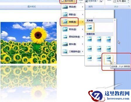 2、在“图片样式”控件组中单击“图片效果”,可以对插入的图片进行效果设置。如果单击“图片效果”→映像→全映像,8pt偏移量,如图7。
