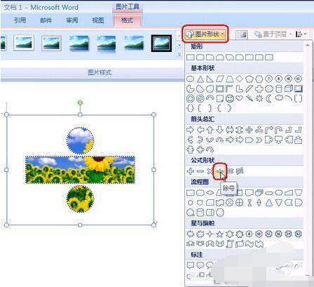 1、单击插入的图片后,在“图片样式”控件组中单击“图片形状”,可以把插入的图片设为我们以前不敢想象的形状,如图6。