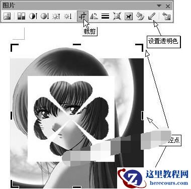 插入要裁剪的图片,选中,单击图片工具栏上的“文字环绕”选择“浮于文字上方”。单击工具栏上 的“四叶草裁图”按钮插入模板,拖到图片上你想要裁剪的位置(见图7),适当调整遮罩的大小。选中图片,单击“图片”工具栏的“裁剪”按钮,拖动裁剪控点 把超出模板的部分裁掉。同时选中模板和图片,剪切,“选择性粘贴”为“图片(png)”,再选中这图片,用“设置透明色”把图片中的白色设置成透明,这样 就完成了四叶草形的裁剪。对于裁剪好的图片还是照样可以设置阴影、旋转等(见图8)。
