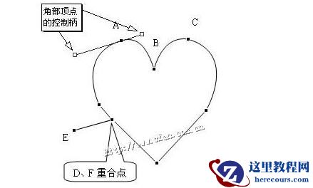 选择绘图工具栏的“自选图形→线条→任意多边形”,单击各个顶点画出图形大概形状,在此要多画 出一个小角D、E、F。然后右击选择编辑顶点,进入顶点编辑状态(见图1)。把顶点F拖到与D重合,使得DEF变成一条线,为了准确对准,此时宜把显示比 例尽量调大。再右击顶点A、B、C选择设置为“角部顶点”,适当调整其两个控制柄即可轻易得到所需弧度,形成带一条线的心形(见图2)。