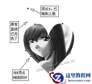 右击裁好的图形,选择“编辑顶点”,拖动顶点E就可以直接调整裁图的位置和缩放比例。把E点向 左拖动则裁图区将向右移动并放大,向右拖则左移,同样还可以上下移动。不过要调整整体尺寸的话还得退出“编辑顶点”状态才能看到图形的尺寸柄。在此,拖动 调整后连接E-DF点的线就有点刺眼了,我们可以通过把图形边线设置为“无线条颜色”来消除它。最后的效果如图4。