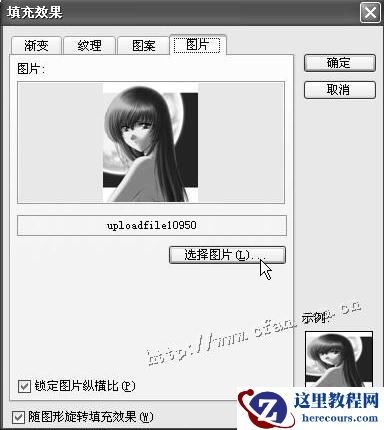 选中此图形,单击绘图工具栏的“填充色→填充效果…”,在“图片”选项卡中单击“选择图片…” 按钮打开要进行裁剪的图形文件,并同时选中“锁定图片纵横比”和“随图形旋转填充效果”选项(见图3)以保证图片不因旋转或调整尺寸而失真、变形。确定后 可以看到图片己被裁成心形。