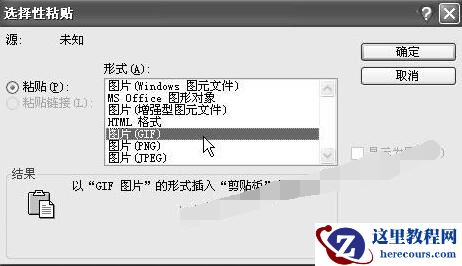 选中黑色四叶草和下面的白色矩形进行复制,再单击菜单栏的“编辑→选择性粘贴”,在“形式”中 选择“图片(GIF)”格式(见图6),确定将图片以gif格式粘贴到文档中。选中粘贴的GIF图片,单击“图片”工具栏上的“设置透明色”按钮,再单击 图形的黑色部分,把黑色设置成透明,就得到一个四叶草形的模板。
