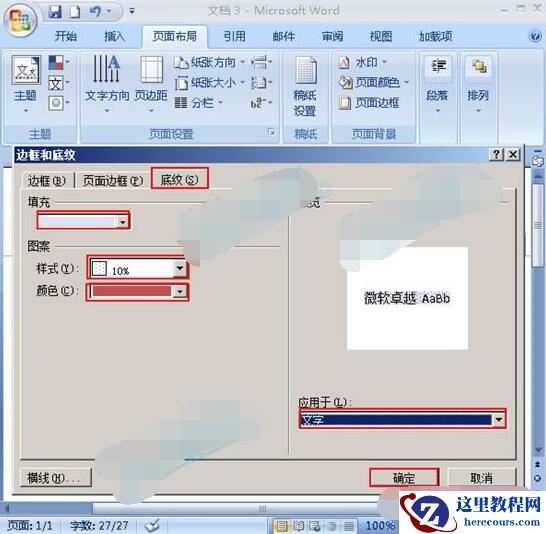2.弹出“边框和底纹”对话框,点击“底纹”选项卡,“填充”颜色,“图案”里的“样式”和“颜色”自己喜欢什么选什么,“应用于”选择文字,然后点击确定。如下图。