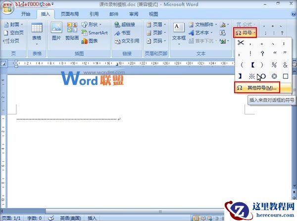 3、按Tab键,就可以看到第5个前导符已经在页面上了,下面点击“插入”菜单,选“符号”按钮,照下拉菜单的“其他符号”选项。