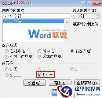 2、这时会弹出一个“制表位”的栏目,选择“17.55字符”的制表位位置,“前导符”点类似省略号的5,然后点确定。
