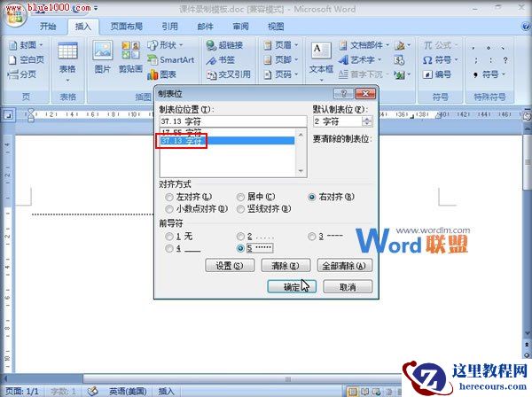 5、现在我们的裁剪线的前半部分已经做好了,后半部分的制作和前半部分一样,双击制表位,不过这次选择的是37.13字符,前导符还是选5号,确定。