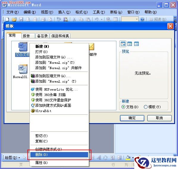 第五步:在弹出的“模板”窗口中,在默认的“常用”选项卡中使用鼠标右键点击“空白文档”,然后在右键菜单中选择“删除”就可以了。如下图所示: