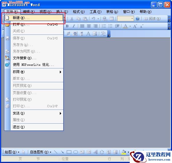 第三步:当看到Word界面后不要激动,因为还没有完哟。现在选择“文件”中的“新建”命令。