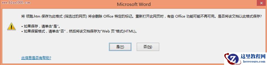 ③弹出Microsoft Office Word对话框,提示存为网页有些功能不可用,问我们是否继续,点击是即可。
