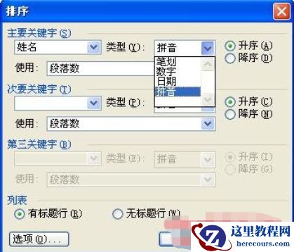 4、在“类型”选项则选择按什么方式进行排序,例如按拼音排序,也就是按拼音的声母排序,这是默认值,如下图: