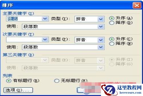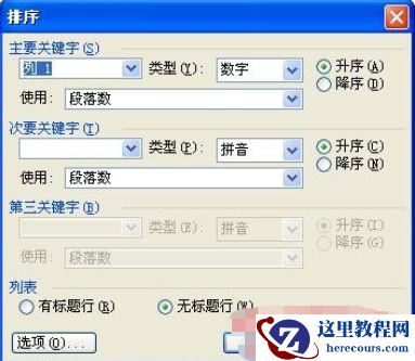 如果表格有标题行,则默认情况下“列表”选项选择“有标题行”,“主要关键字”下是以标题行的关键字出现的,如下图:
