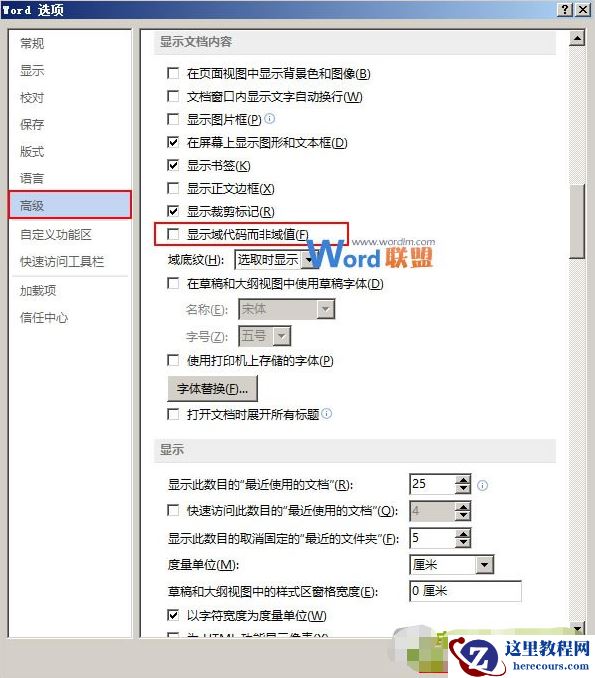 3、此时会打开一个“Word 选项”窗口,我们切换到“高级”项,然后去掉勾选“显示文档内容”区域中的“显示域代码而非域值”选项,并单击“确定”按钮。