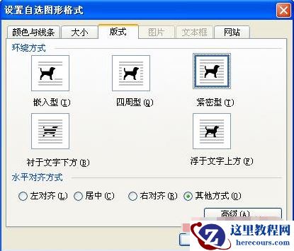 4、选择“版式”,设置图形“环绕方式”,如选择“紧密型”,使图片跟文字融合在一起。