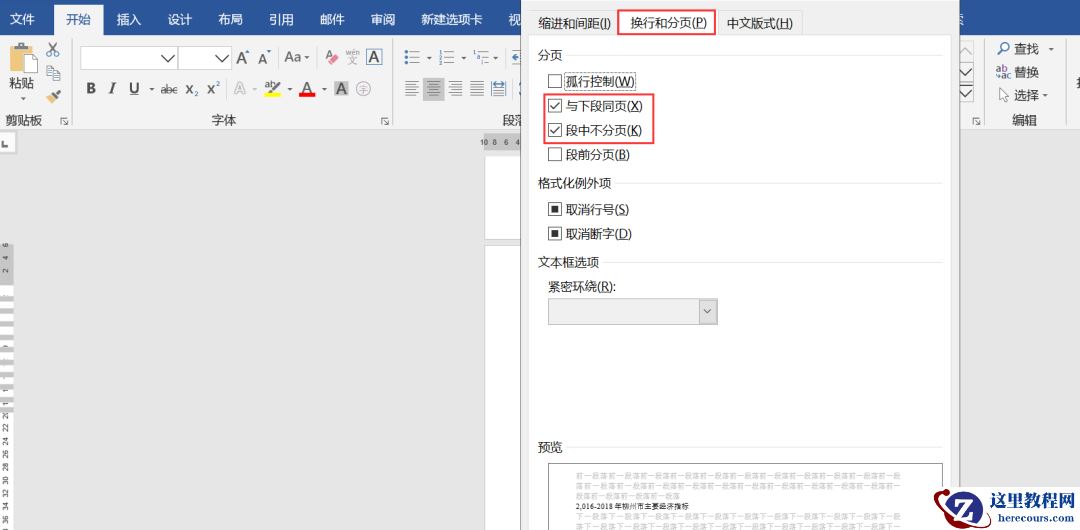 选中内容,点击开始——段落,在打开的段落对话框中勾选【换行和分页】,勾选【与下段同页】和【段中不分页】的复选框,点击确定。