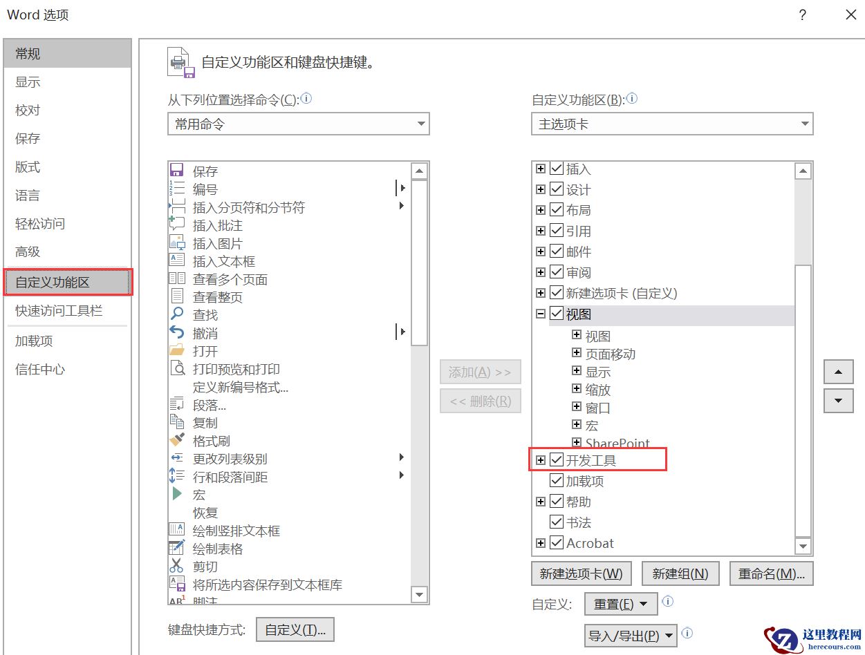 2、 如果选项卡中没有开发工具,可以在自定义功能选项中找到,如下图所示:
