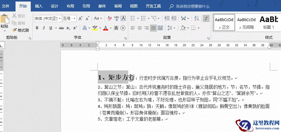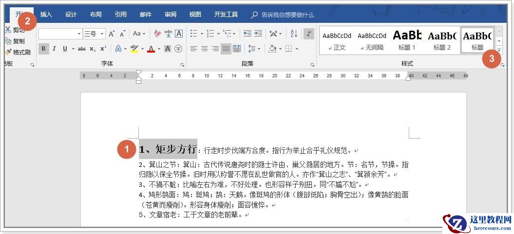 选中序号与四字成语,在【开始】菜单中【样式】功能区选择相应的标题级别,选择的是【标题】:
