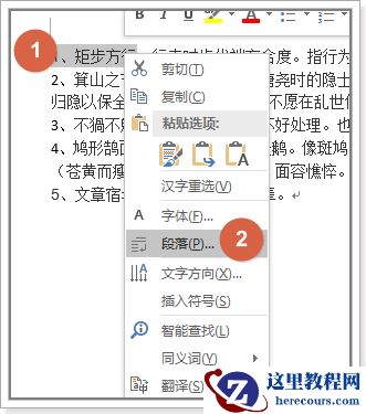选中序号与四字成语,【右键】——【段落】: