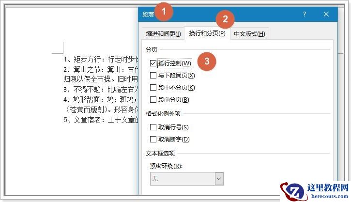 【段落】对话框中选择【换行和分页】选项卡,勾选【孤行控制】: