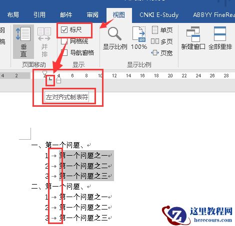 编号与内容之间的箭头,是“制表符”,在选中“显示/隐藏编辑标志”的情况下能看得见。