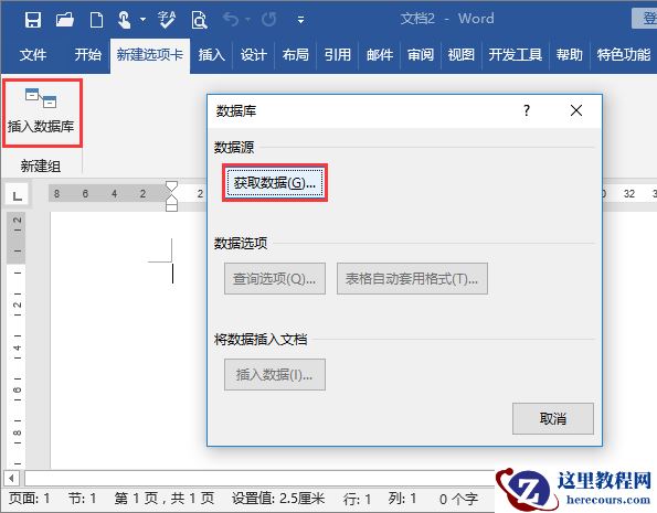 (2)此时,将会看到菜单栏中增加了一个“新建选项卡”菜单,点击【新建选项卡】-【插入数据库】按钮。打开“数据库”对话框,单击“获取数据”按钮。