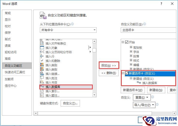 (1)打开Word,选择【文件】-【选项】命令,打开”Word选项“对话框,选择”自定义功能区“选项卡,在”从下列位置选择命令“下拉列表中选择”所有命令“,在下方的列表框中选择”插入数据库“命令,单击”新建选项卡“按钮在右侧列表框中新建一个选项卡,然后单击”添加“按钮将选择的命令添加到选项卡中,最后单击”确定“按钮。