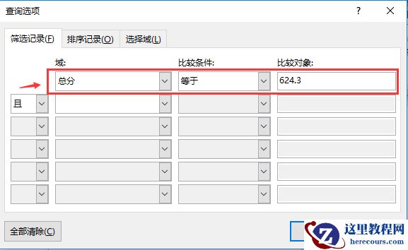 (5)打开“查询选项”对话框,设置“域”为“总分”;“比较条件”为“等于”;“比较对象”为“624.3”,再单击“确定”按钮。