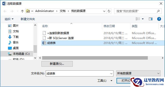 (3)打开“选取数据源”对话框,选择“成绩表.docx”文档,单击“打开”按钮。
