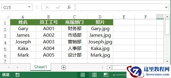 (2)将胸卡所需要的员工信息录入到Excel中,表格中包括员工的姓名、工号和用员工姓名命名的带格式后缀的照片名。
