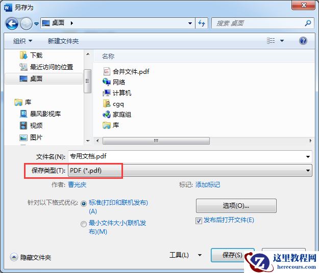 Step01 先将Word文档另存为PDF文件,点击【文件】 – 【另存为】,在【保存类型】中选择PDF类型。