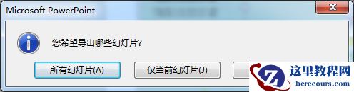 注意,在点击【保存】按钮时,会弹出一个提示对话框。提示保存所有幻灯片(注:指将PPT里面的所有的幻灯片都保存成一张一张图片文件格式),还是只保存当前幻灯片(注:指对当前选中的幻灯片保存成图片格式),根据需要选择保存即可。