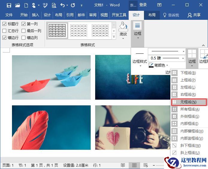 (5)再次选择整个表格,点击【表格工具】-【设计】-【边框】。选择【边框】-【无线框】选项,取消表格边框。