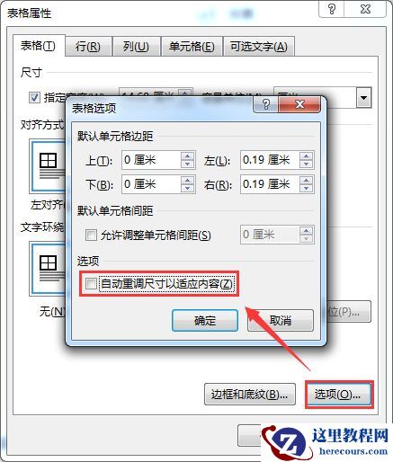 (3)打开“表格属性”对话框,点击“选项”按钮。将“默认单元格边距”均设置为0,然后取消勾选“自动重调尺寸以适应内容”复选框,依次单击“确定”按钮。