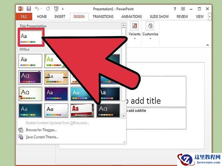 高亮显示标题,然后点击“标题1”。你必须单独设置每个标题的样式。文本将变大,并且加粗变成蓝色 – PowerPoint将使用此格式来确定幻灯片标题。