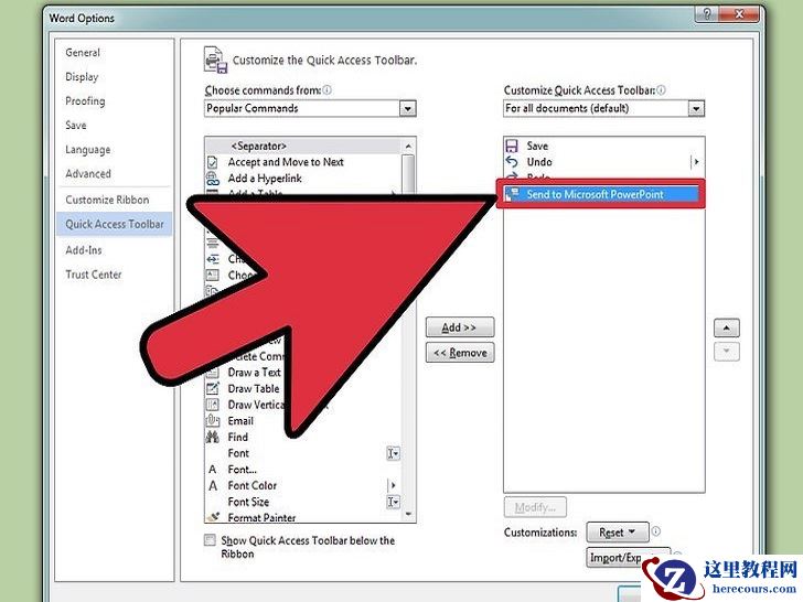 使用“文件” → “发送到PowerPoint”将文档发送到PowerPoint。PowerPoint将获取文档并将其自动转换为幻灯片。如果看不到“发送到PowerPoint”按钮,尝试让它显示。点击“文件” → “选项”打开选项窗口。点击“快速访问工具栏”。选择“选择命令自:”菜单下的“所有命令”。向下滚动按字母顺序列出的命令,直到找到“发送到Microsoft Powerpoint”。点击“添加>>”。