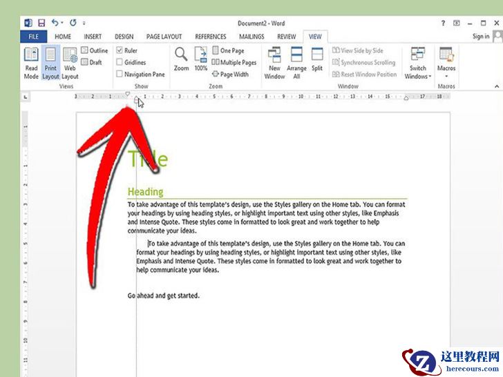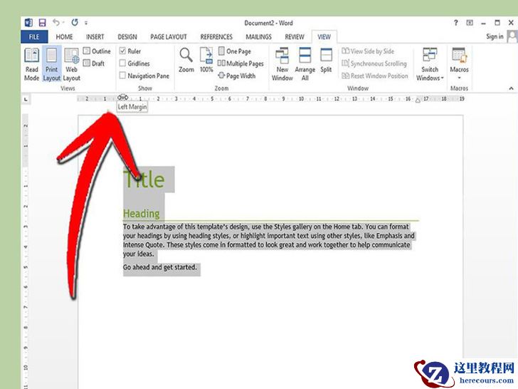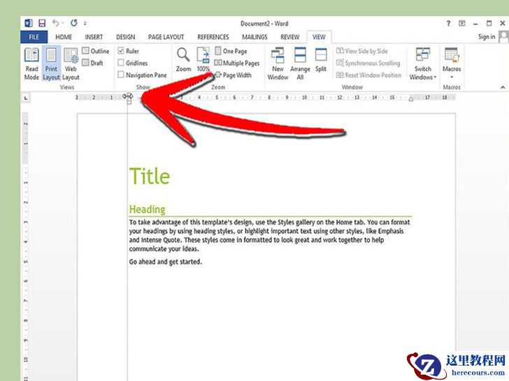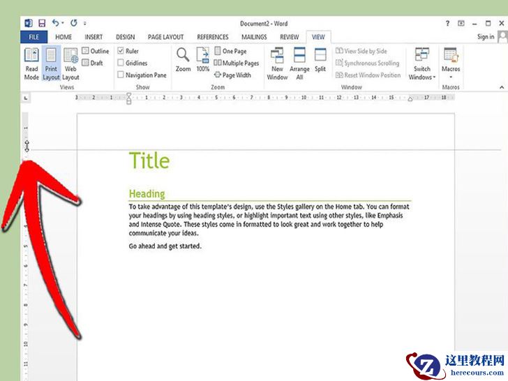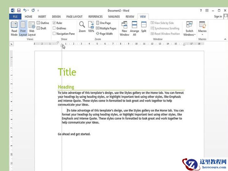 找到页边距条。左右两侧灰色的区域代表左右两侧页边距的宽度。要是在页面顶部找不到这条标尺,你可以点击“显示”标签,点击“显示”内的“标尺”选项。在Word 2003中,点击显示菜单,选择“标尺”即可。