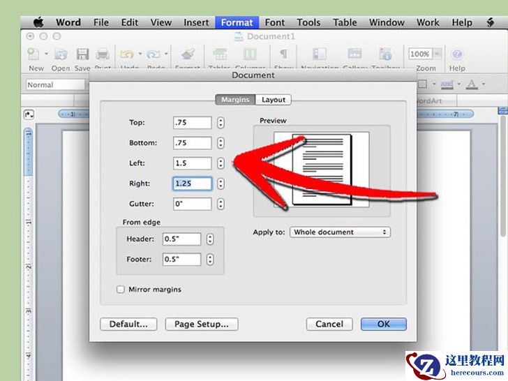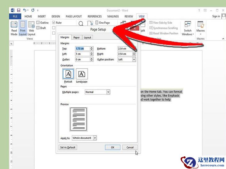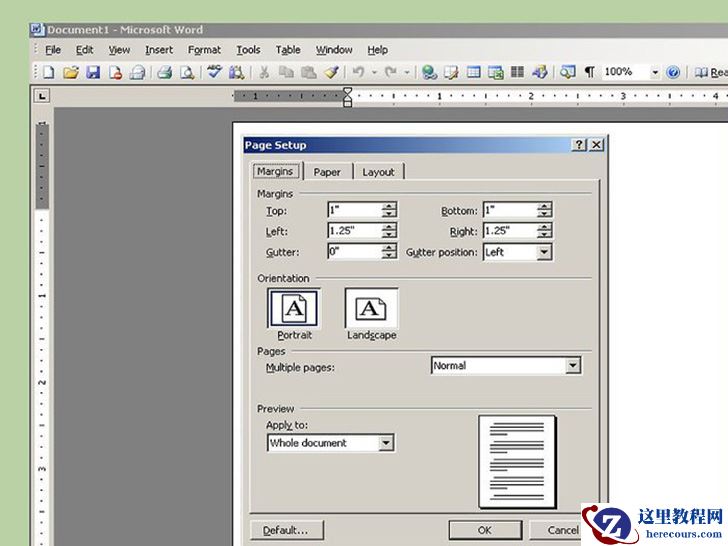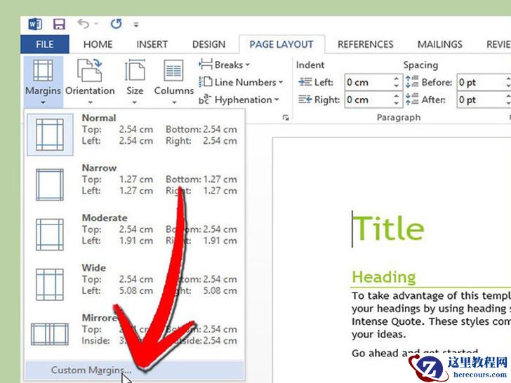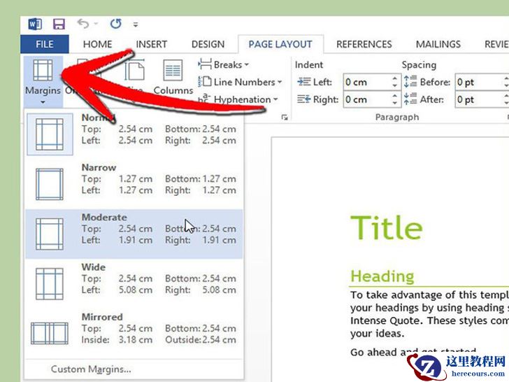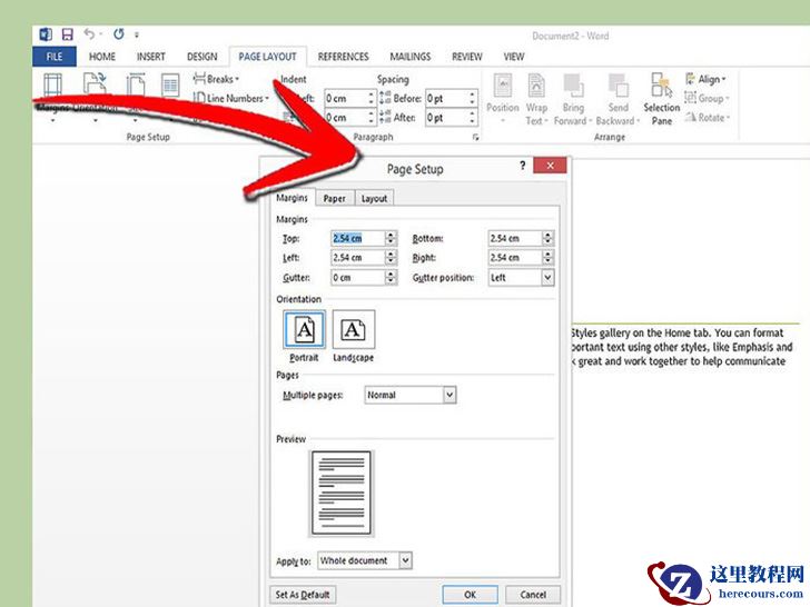 点击“页面布局”标签。这个标签里有各种调整文档格式要用的工具。这里的屏幕截图是Word 2013版的,但也适用于2010版和2007版的。Word 2003版中,点击文件菜单,选择“页面设置”,点击页面边距设置,你可以跳到第四步,了解使用页面设置的方法。