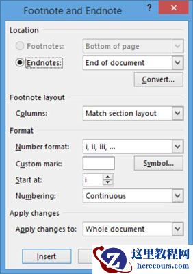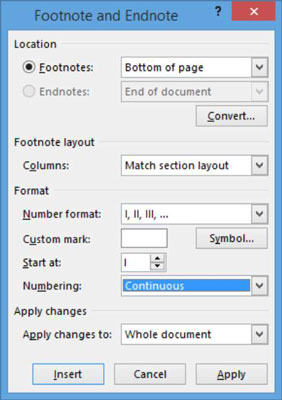 在您的传记文档的“引用”选项卡上,单击“脚注”组中的对话框启动器。将打开“脚注和尾注”对话框。从数字格式下拉列表中,选择大写的罗马数字(I,II,III),然后单击“应用”。新的编号格式将应用在文档中。