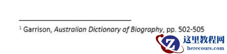 键入脚注,例如,驻军,《澳大利亚传记词典》,第502–505页。选择文本适当的文本“澳大利亚传记词典”,然后选择“首页”→“斜体”(或按Ctrl + I)使其变为斜体。脚注出现。