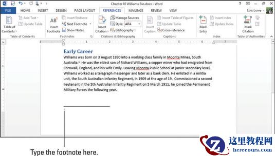 打开需要脚注的Word文档。对于此示例,将使用传记。单击第一个句子的末尾,需要添加脚注。在此示例中,在“早期职业生涯”标题下第一段的第一句话之后,将插入点移动到句点之后,然后选择“引用”→“插入脚注”。小数字1出现在插入点所在的位置,相应的脚注出现在页面底部。插入点移到脚注中,因此您可以键入其文本。