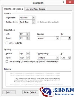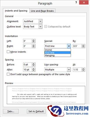 单击确定。现在,该段落的每侧缩进0.5英寸。单击一个新的段落,然后再次单击对话框启动器以重新打开“段落”对话框。在“缩进”下,打开“特殊”下拉列表,然后选择“第一行”,如下所示。出现第一行缩进默认值0.5英寸。