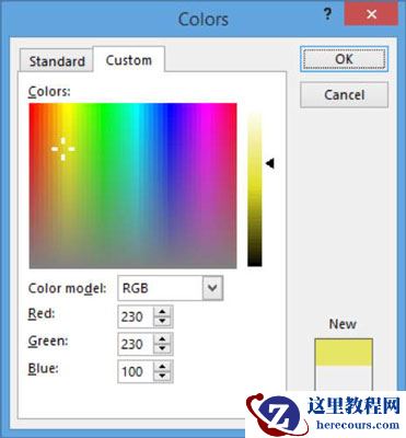 单击您喜欢的任何颜色。页面背景变为该颜色。选择设计→页面颜色→更多颜色。将打开“颜色”对话框。单击自定义选项卡;输入以下值:红色230,绿色230,蓝色100;然后单击确定。背景变为黄色阴影。