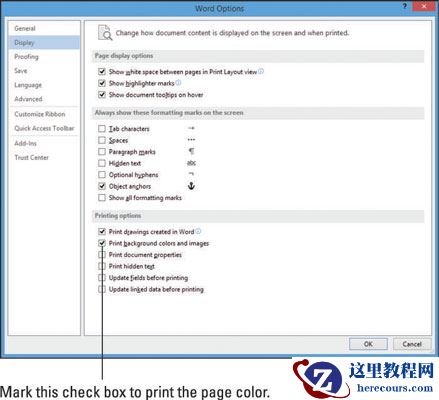 选择“文件”→“打印”。请注意,打印预览不包括背景。单击选项以显示“ Word选项”对话框。单击左侧导航窗格中的显示。选中打印背景颜色和图像复选框,然后单击确定。