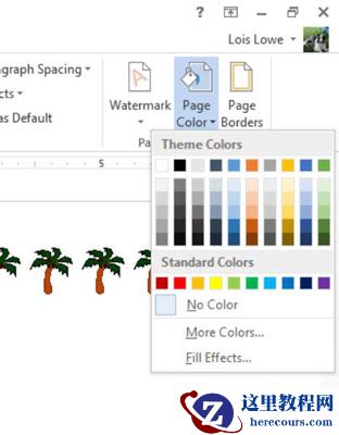 在Word 2013文档中,选择“设计”→“页面颜色”。出现一个调色板。