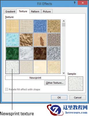 选择设计→页面颜色→填充效果。将打开“填充效果”对话框。单击“纹理”选项卡,单击“新闻纸”纹理,然后单击“确定”。背景更改为新闻纸纹理。如果您拥有自己的纹理文件,则可以使用它们。单击“其他纹理”按钮浏览硬盘上的文件。