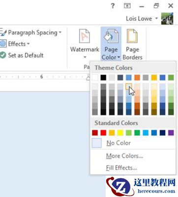 选择“设计”→“页面颜色”,然后选择“蓝色,口音1”,“浅80%”。