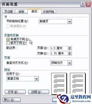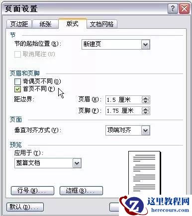 设置文档首页不显示页眉 点击【页眉和页脚】工具栏中的“页面设置”,即弹出“页面设置”对话框。然后,在“版式”选项卡中勾选“首页不同”选择框即可。