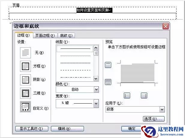 在页眉框中选中全部页眉文字,打开【格式】菜单中的【边框和底纹】,选择“边框”标签,可以修改和设置页眉的边框。在这里,可以设置有无边框, 可以设置边框的线型、颜色、宽度等。(“页面边框”标签是用来设置文档边框的。) 选择“底纹”标签,可以设置页眉文字或段落的底纹。