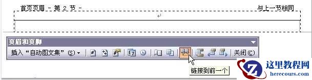 设置文档不同部分显示不同的页眉内容 需要特别注意的是,设置第二节及此后各节的时候,在页眉框右上角有一个“与上一节相同”的提示。同时,【页眉和页脚】工具栏上的“连接到前一个”按钮呈按 下状态。这表示本节继承了上一节的页眉和页脚。在这种情况下,如果改变本节页眉和页脚,那么,上一节的页眉和页脚也会被同步改变;如果返回上一节编辑页眉 和页脚,本节的页眉和页脚同样会改变。